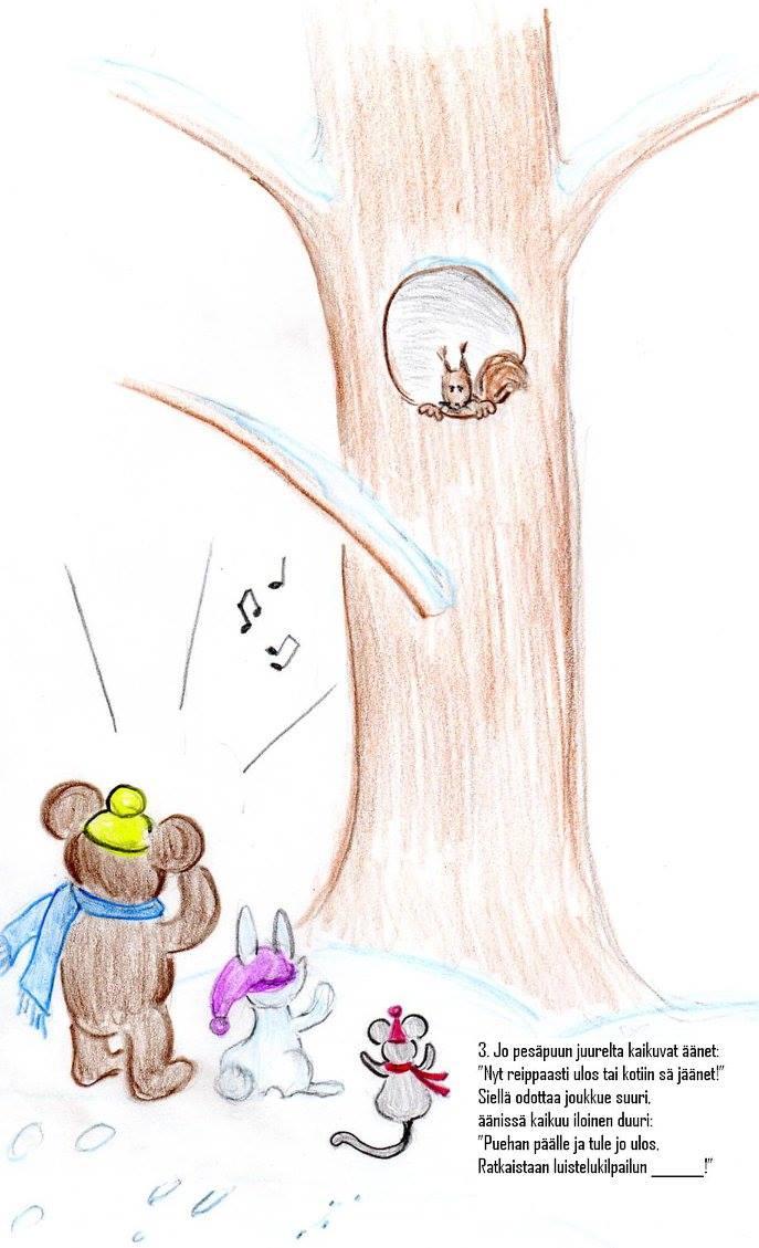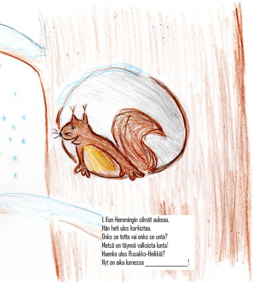 Kun Hemmingin silmät aukeaa, Onko se totta vai onko se unta? Metsä on täynnä valkoista lunta! Haenko ulos Rusakko-Heikkiä? Nyt on aika lumessa _________! |