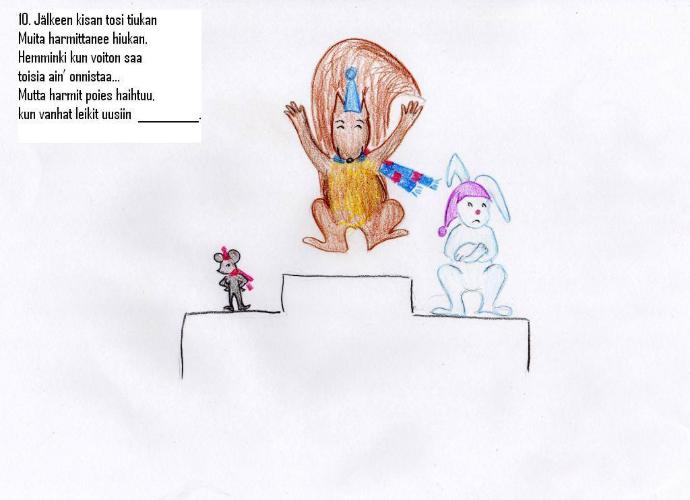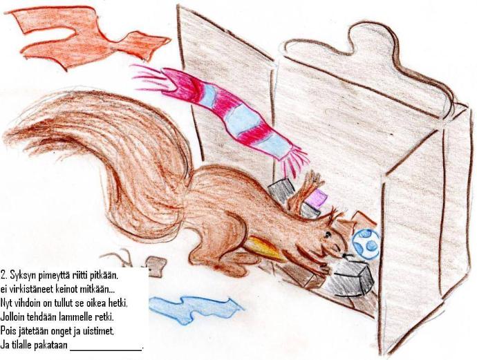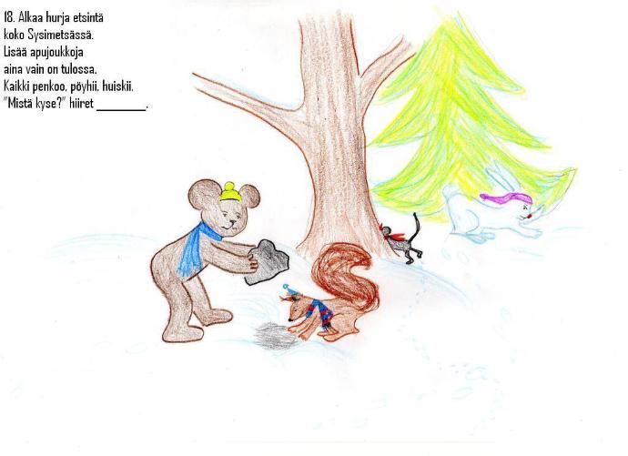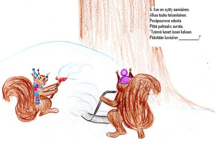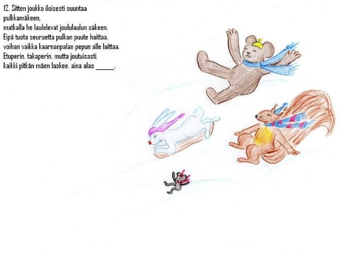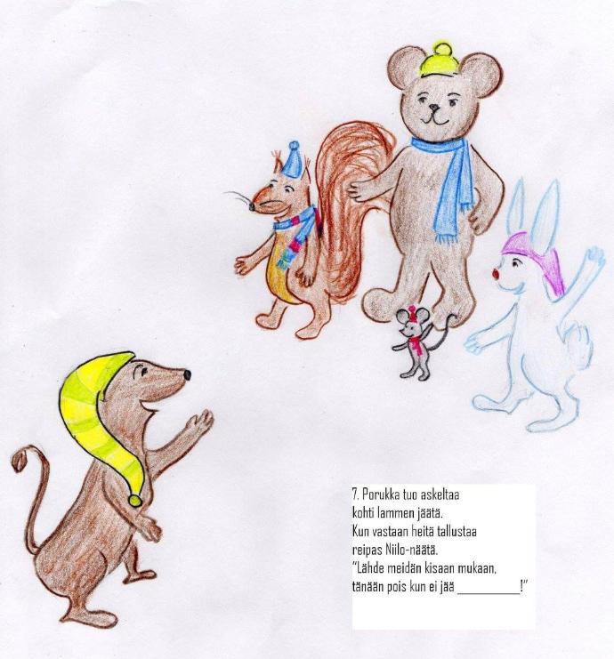 Porukka tuo askeltaa Kun vastaan heitä tallustaa reipas Niilo-näätä. ”Lähde meidän kisaan mukaan tänään pois kun ei jää _________!” |