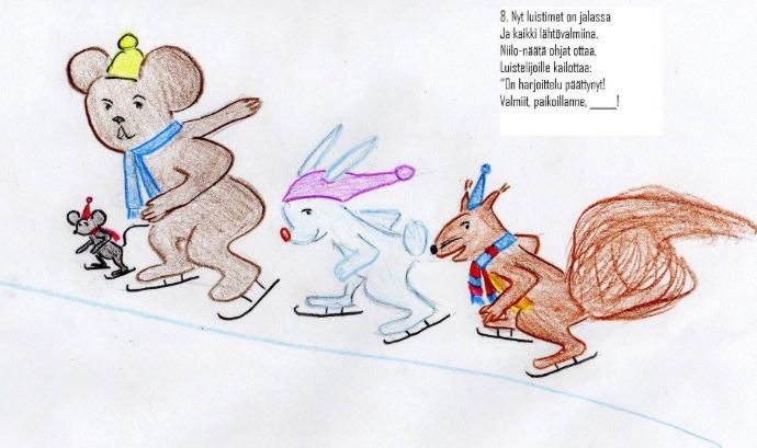 Nyt luistimet on jalassa Niilo-näätä ohjat ottaa, Luistelijoille kailottaa: ”On harjoittelu päättynyt! Valmiit, paikoillanne, _____! |