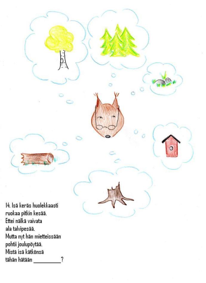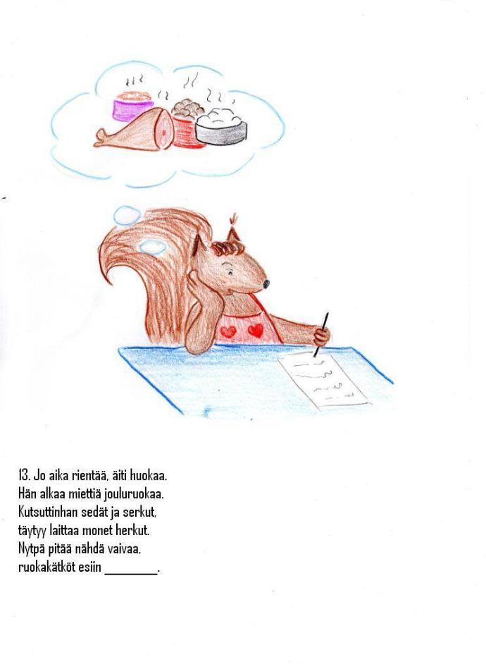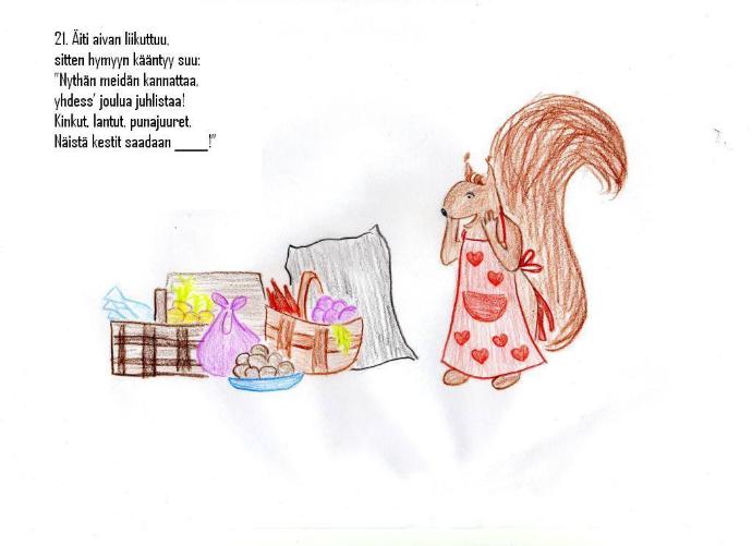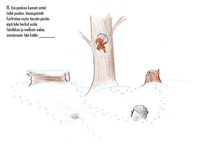 Isä keräs huolekkaasti Ettei nälkä vaivata ala talvipesää. Mutta nyt hän mietteissään pohtii joulupöytää. Mistä isä kätkönsä tähän hätään ___________? |
