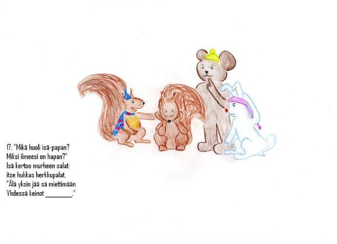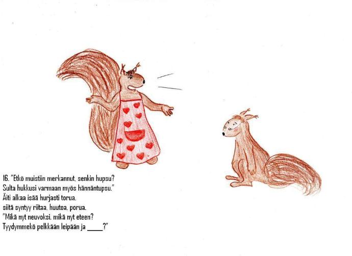 senkin hupsu? Äiti alkaa isää hurjasti torua, siitä syntyy riitaa, huutoa, porua. ”Mikä nyt neuvoksi, mikä nyt eteen? Tyydymmekö pelkkään leipään ja _____?” |