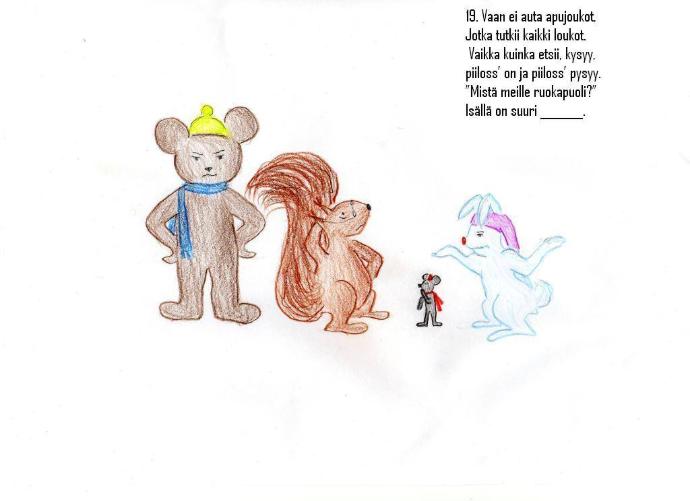 Vaan ei auta apujoukot, Vaikka kuinka etsii, kysyy, piiloss’ on ja piiloss’ pysyy. ”Mistä meille ruokapuoli?” Isällä on suuri _______. |