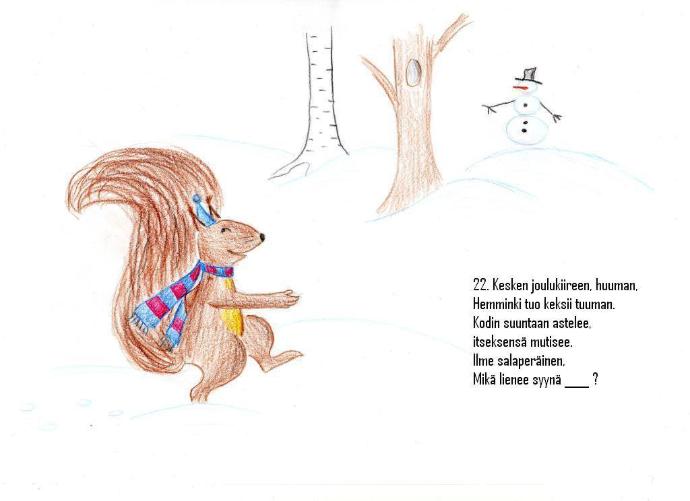 Kesken joulukiireen, huuman, Kodin suuntaan astelee, itseksensä mutisee. Ilme salaperäinen, Mikä lienee syynä ____ ? |