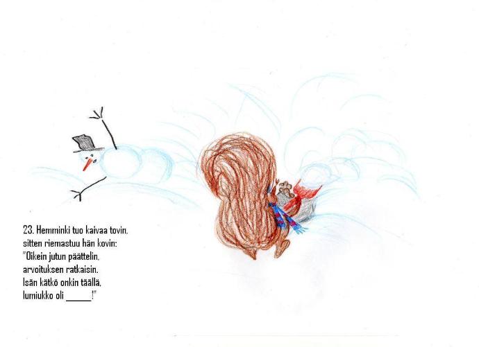 Hemminki tuo kaivaa tovin, ”Oikein jutun päättelin, arvoituksen ratkaisin. Isän kätkö onkin täällä, lumiukko oli ______!” |