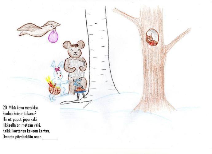 Mikä kova metakka, Hiiret, puput, jopa käki, liikkeellä on metsän väki. Kaikki kortensa kekoon kantaa, Omasta pöydästään osan ________. |