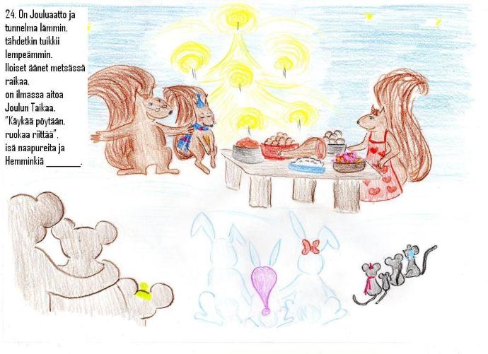 lämmin, Iloiset äänet metsässä raikaa, on ilmassa aitoa Joulun Taikaa. ”Käykää pöytään, ruokaa riittää”, isä naapureita ja Hemminkiä ________. |