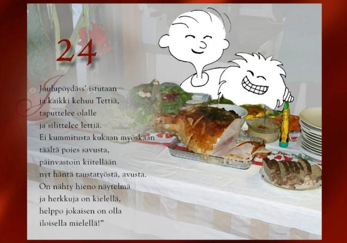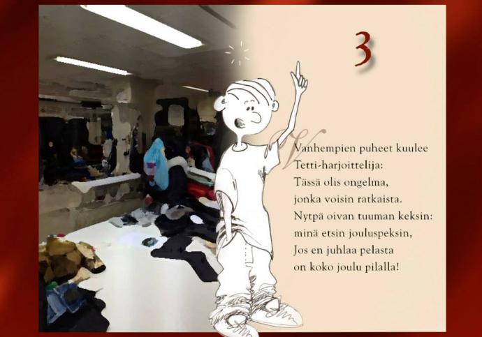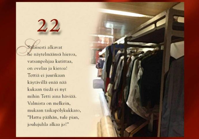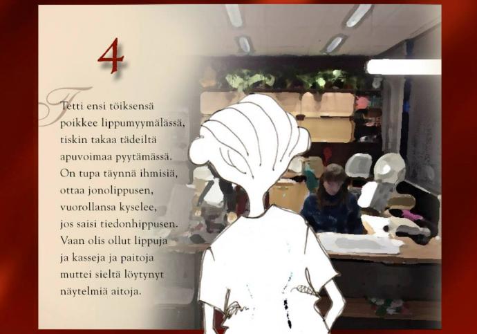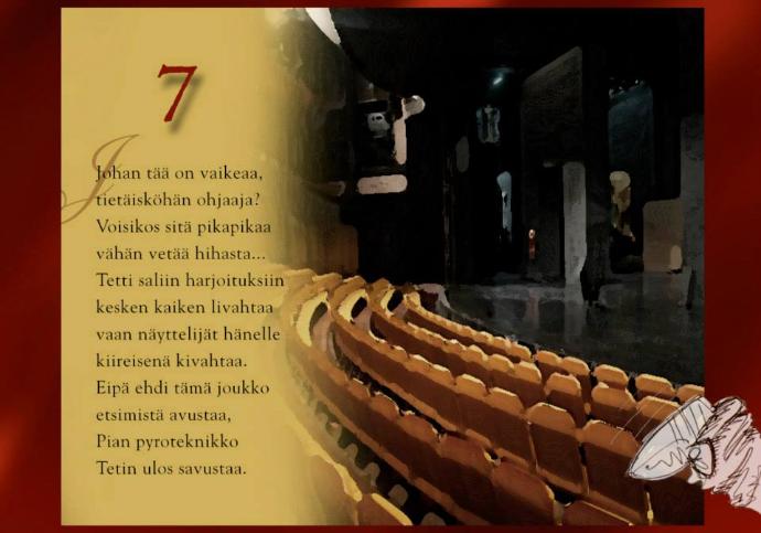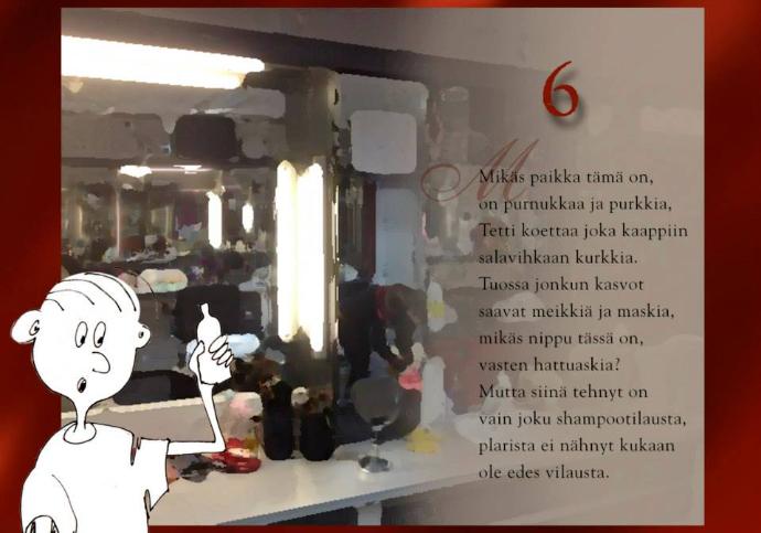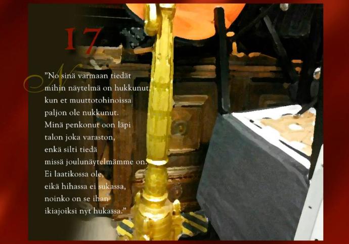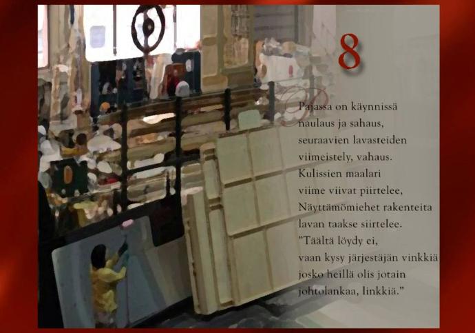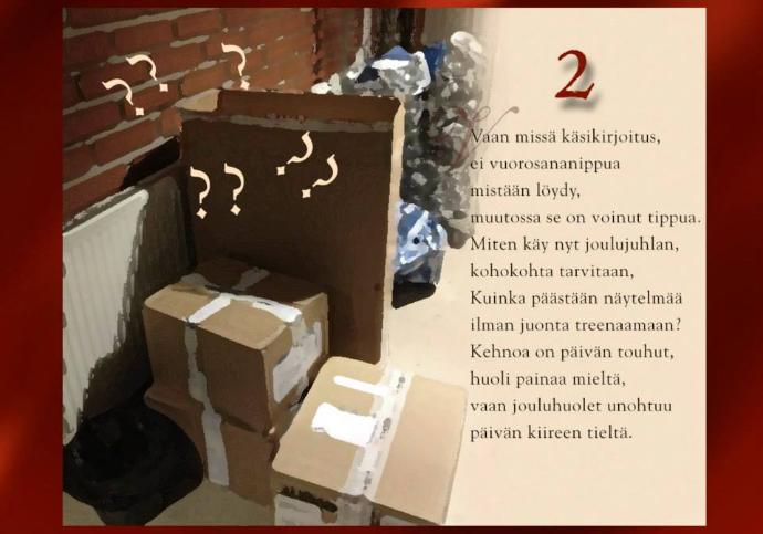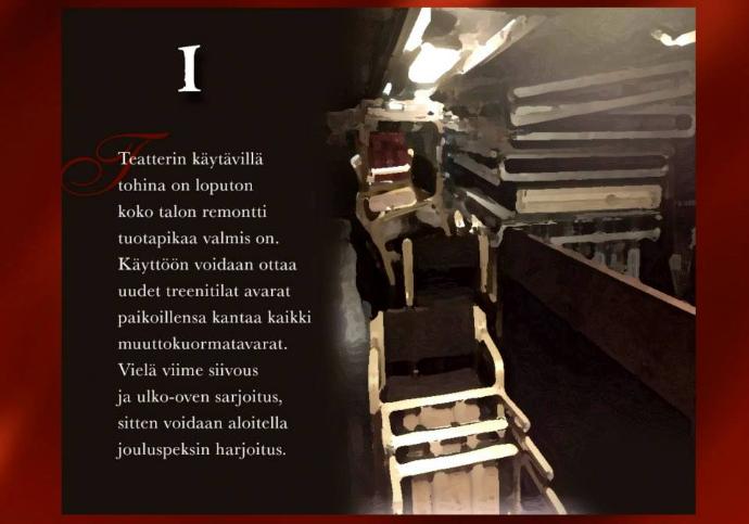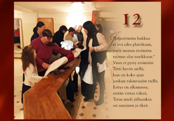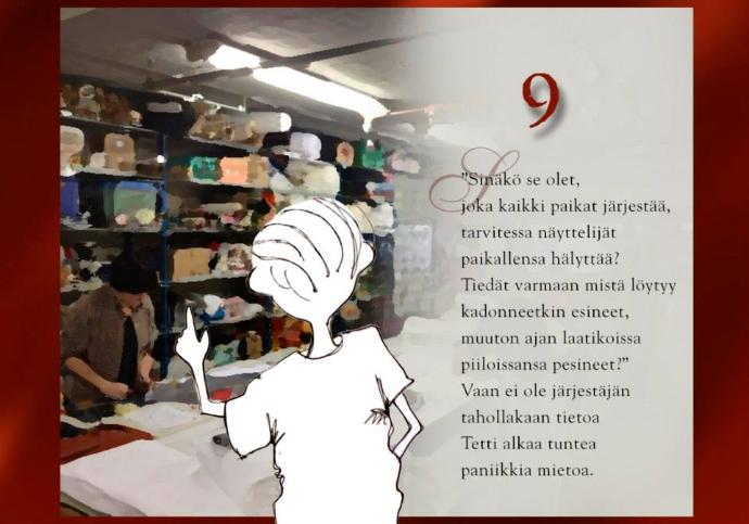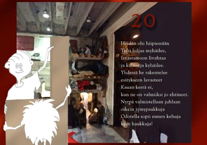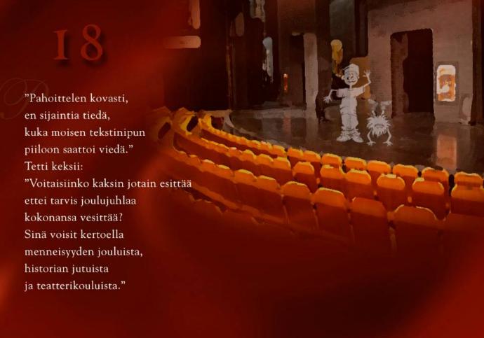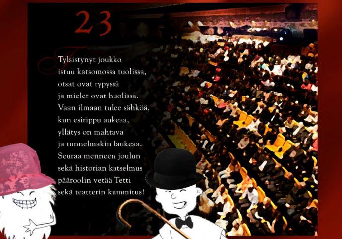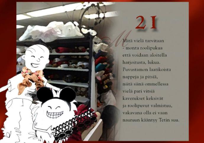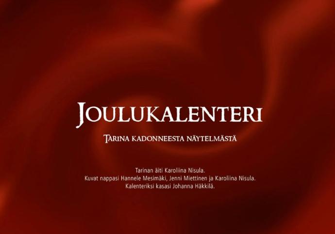 Arki Tampereen Työväen Teatterin markkinointitiimissä innoitti tarinaan kadonneesta näytelmästä. Kalenterin luukut tuovat esiin kaikkea sitä, mitä esitysten taustalla tehdään. Johannan lisäksi valokuva-apuna olivat Jenni Miettinen ja Hannele Mesimäki.