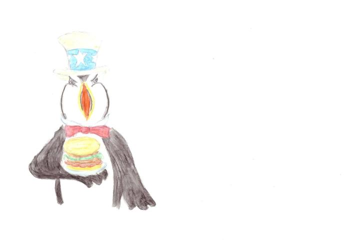 | Alkaa parven johtaja äänekkäästi spiikkaan: "Jos lähdettäisiin Ameriikkaan!" "Niin kauas? Ei tunneta reittiä. Ei jenkkilinnut ymmärtäis meittiä. Eikä mulle niiden ruoka maista En oo koskaan sietänyt hampurilaista." |