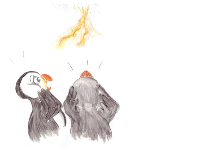 Haikeana jouduimme luopumaan Nasusta, joka eli pikkuisen siilinelämän. Nyt inspiraatioksi muodostuivat Islannin reissuilta puheisiin tulleet Puffinit eli lunnit. Islannissa oli juuri meneillään tulivuoren purkaus, joka käynnisti tämän tarinan.