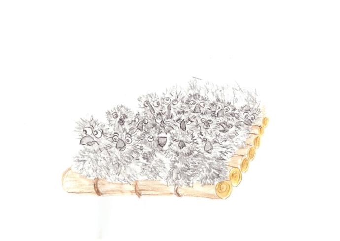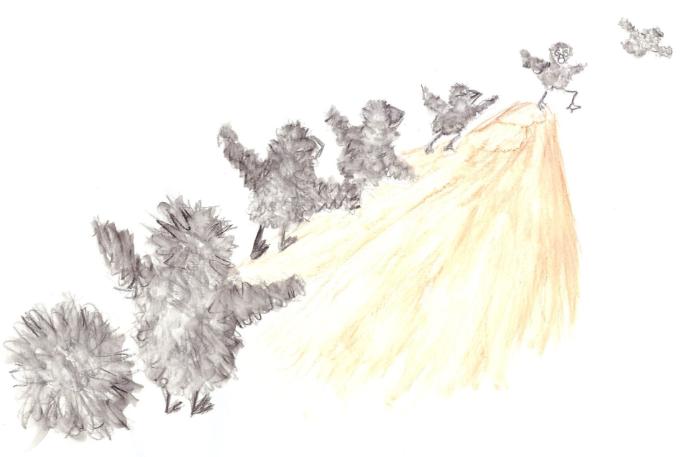 | Then it is time learn how to fly. Some of them moan and keep asking "why?" The teacher responds: "you need to fledge To spread your wings when jumping off the edge." Soon in the air is the whole flock, Nobody's scared or in a shock. |