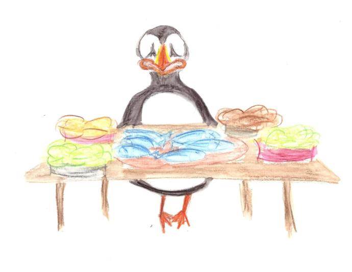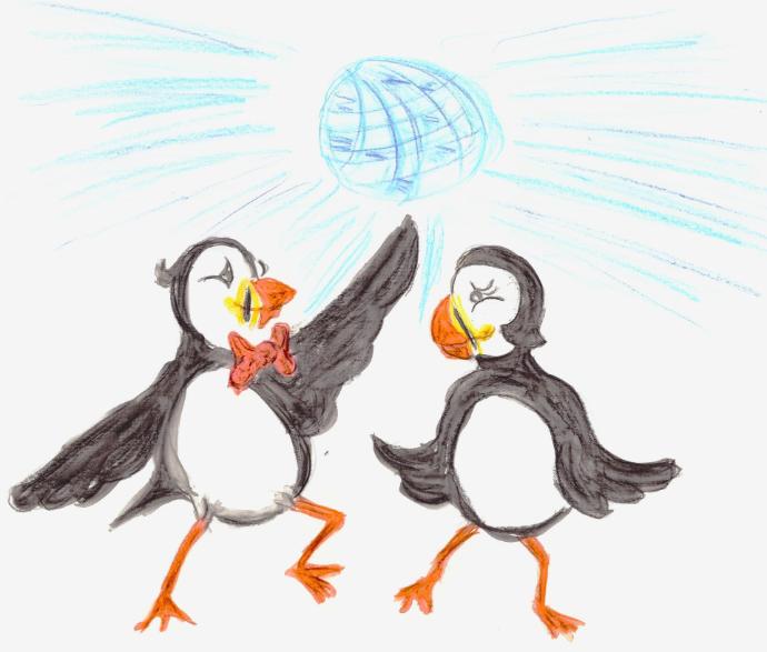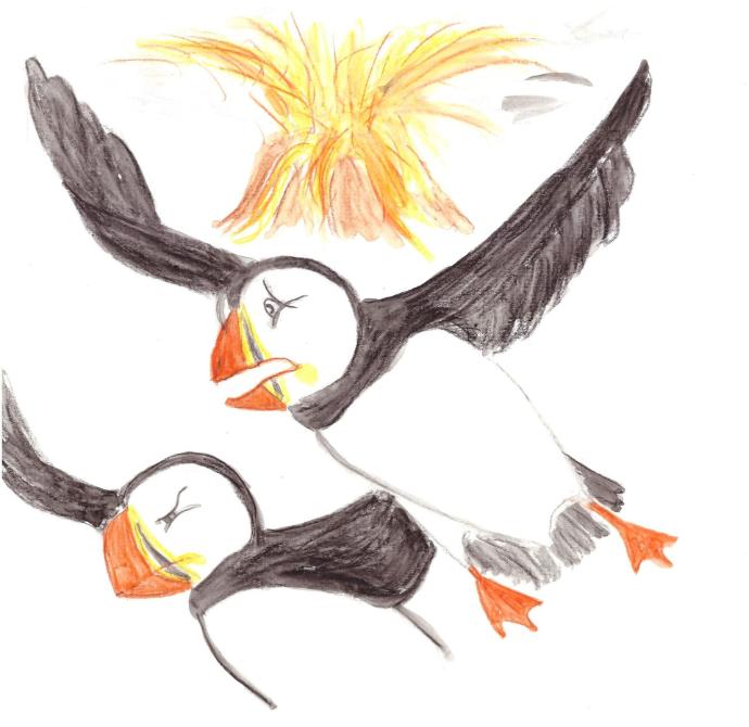 | Everyone starts hassling and huffin' Busy as bee is every puffin! The swimming lessons continue as planned Great fjord waters are easily at hand. Pufflings compete who dives really deep He gets a medal that's his to keep. |