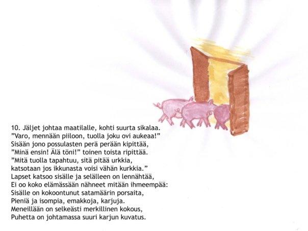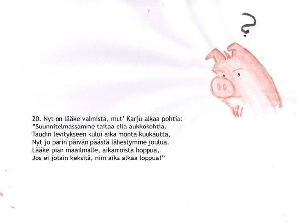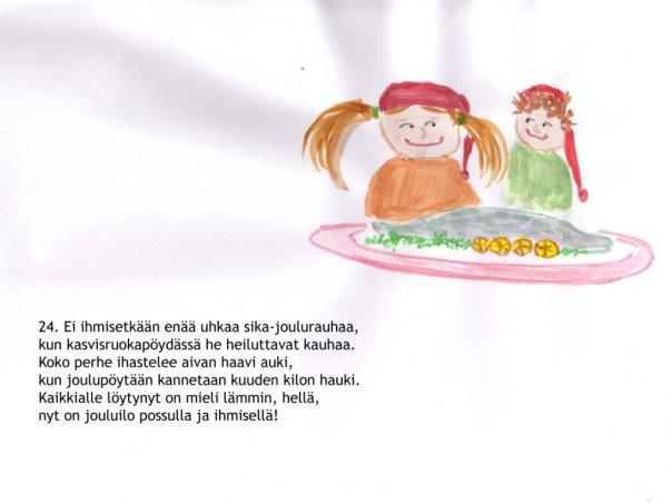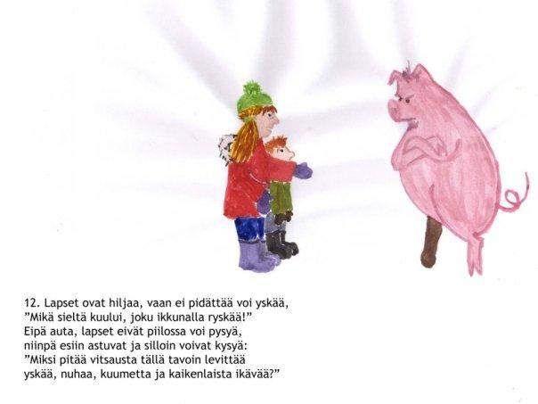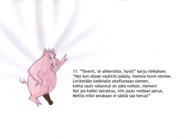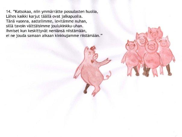 Nyt joulukalenteri siirtyi entistä syvempiin vesiin. Ajankohtainen sikainfluenssa johdatti tarinan kohti Eläinten valtakuntaa. Julkaisufoorumi siirtyi Facebookiin, mikä olikin sopivampaa kuin sähköpostilöhetykset pahaa-aavistamattomille sukulaislapsille. Lukekoon ken uskaltaa!