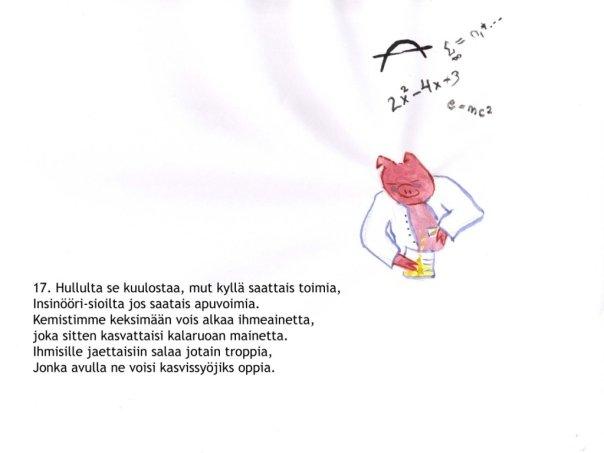 | “It might work, though it feels crazy”, the science-pig sounds slightly hazy. “I’ll get to it and work real hard, maybe we can keep our lard. If we spread out a magic powder, that gives a craving for veggie chowder…? |