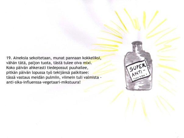 | He works all day and slaves away, he never takes a rest, the children watch him quite impressed, don’t bother and don’t pest. A little this, a little that, this is a killer blend, that makes the veggie-biting, a new and global trend! It’s ready now, come on and see, I’ve used my bestest tricks: the anti-swine-flue-vegetarian-and-fishy-mix! |